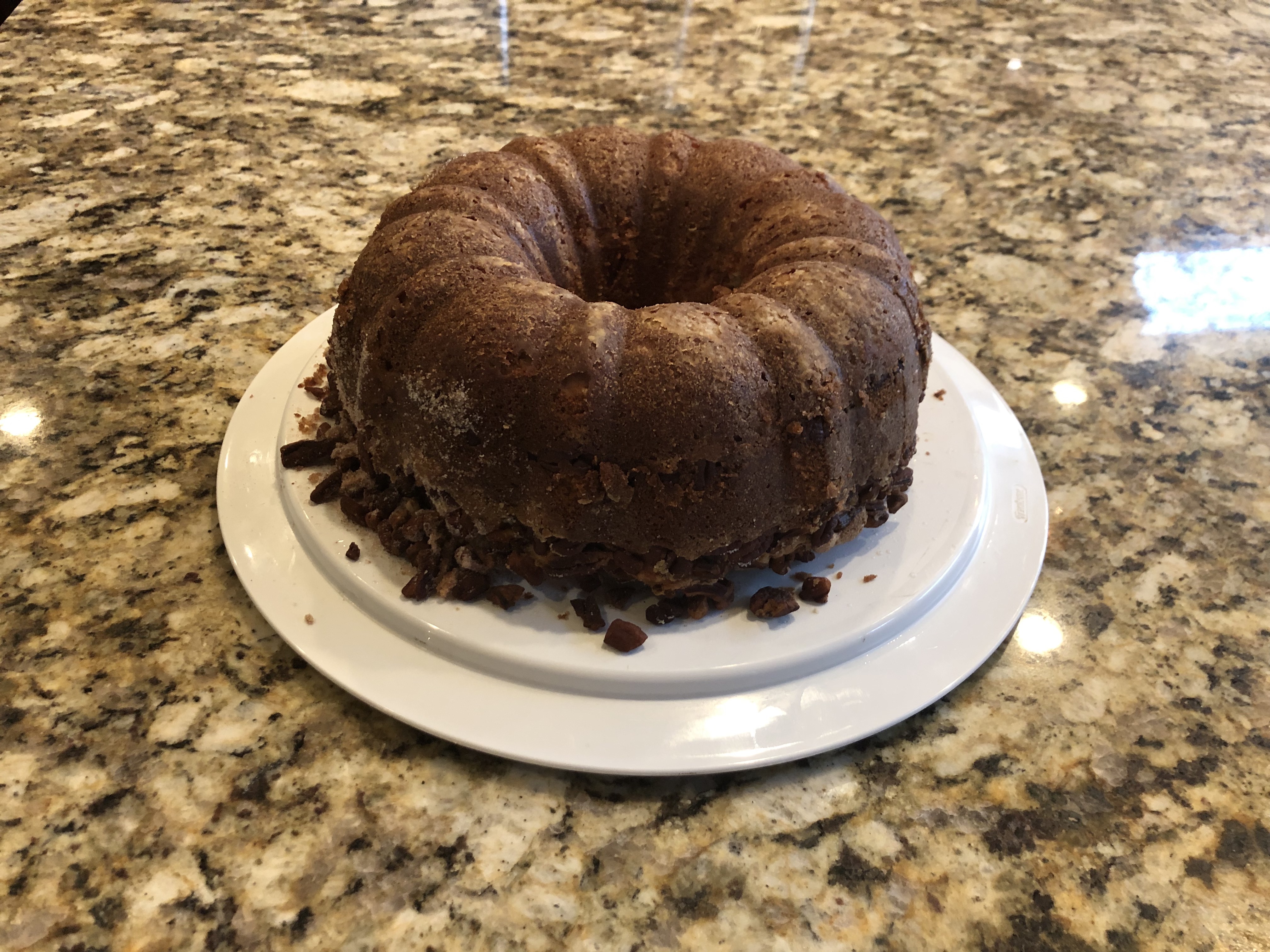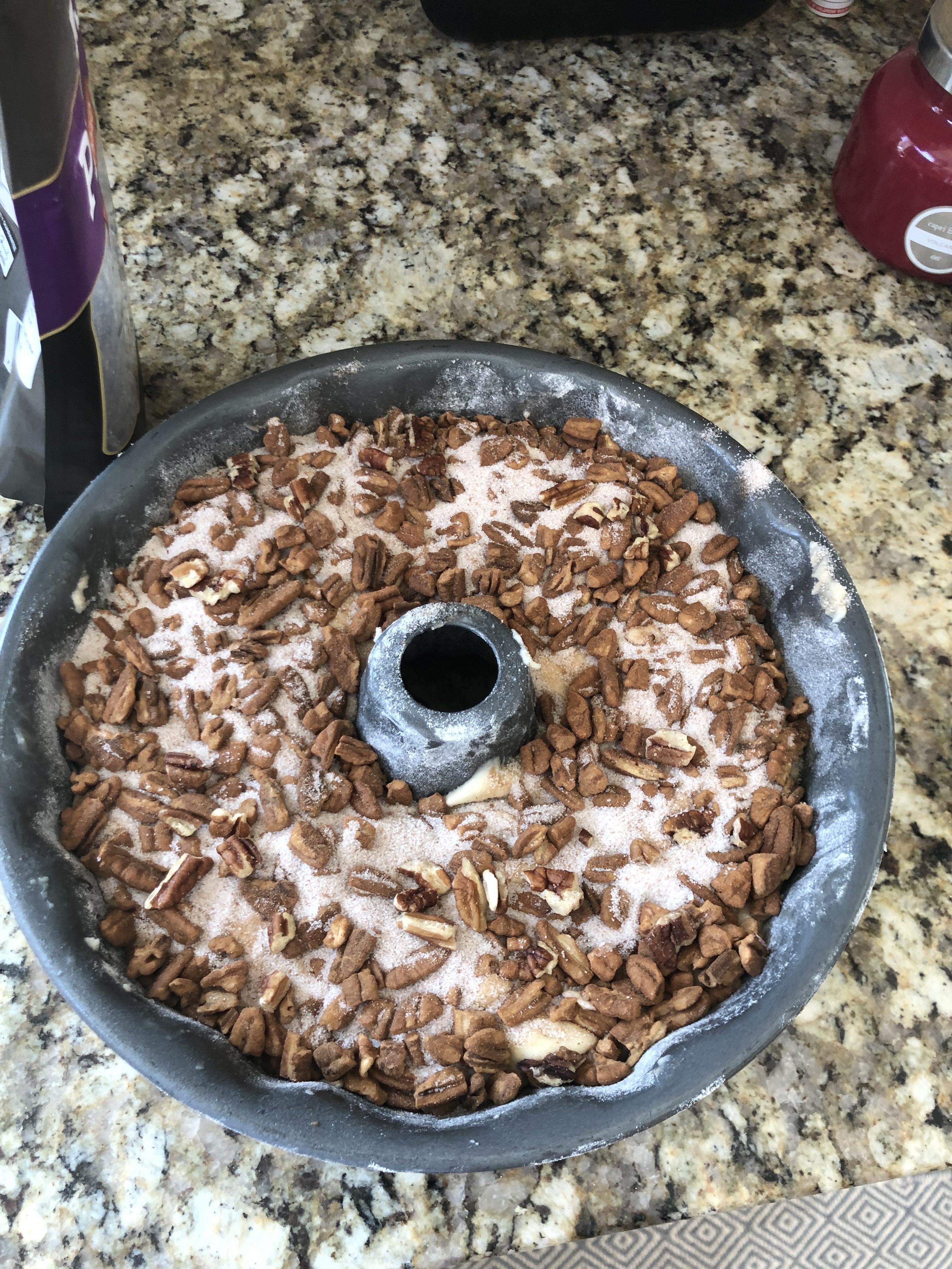 In a separate bowl, mix together 3/4 cup of sugar, the pecans and the cinnamon.Put half of the cake mixture into the prepared bundt pan.