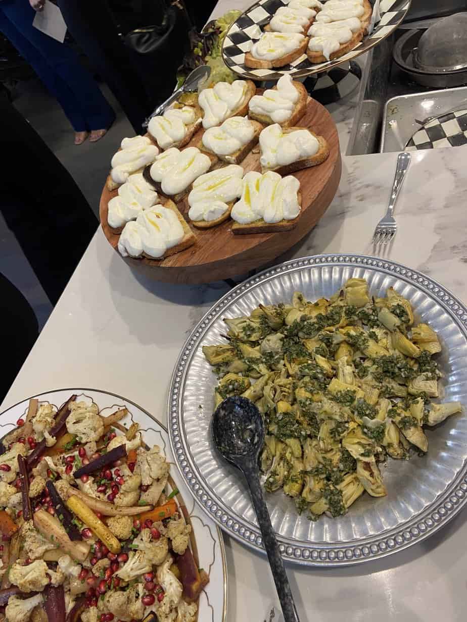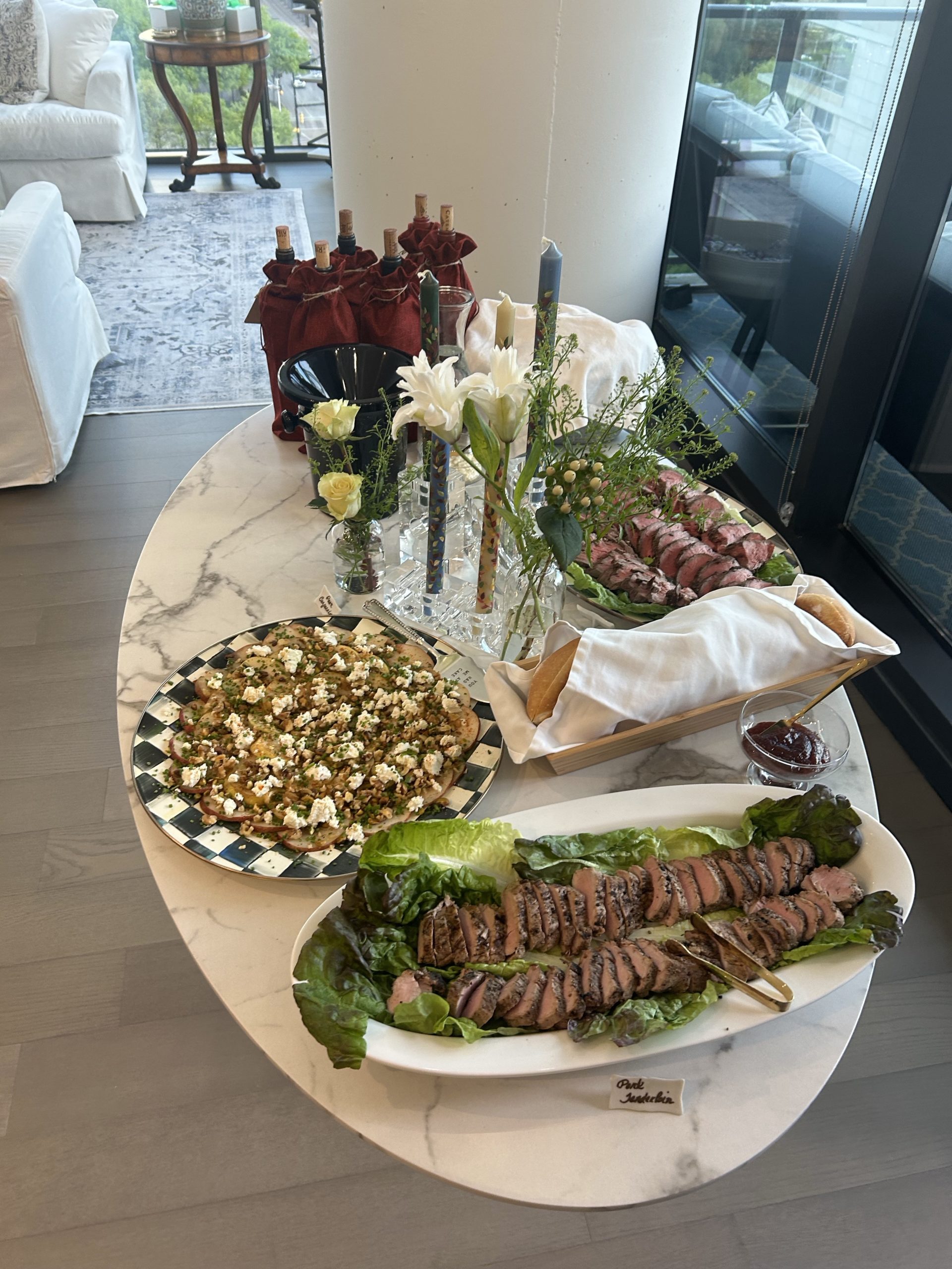 We felt like it was important to have plenty of food when tasting so many wines. Because we began the party at 7pm, it was prime eating time. Our menu consisted of meat/cheese charcuterie, beef tenderloin/pork tenderloin with accompanying breads/spreads, charcuterie, pear carpaccio, citrus salad boats, whipped ricotta toast, roasted carrots and cauliflower, crispy artichoke hearts and orange olive oil cake bites. A sampling: