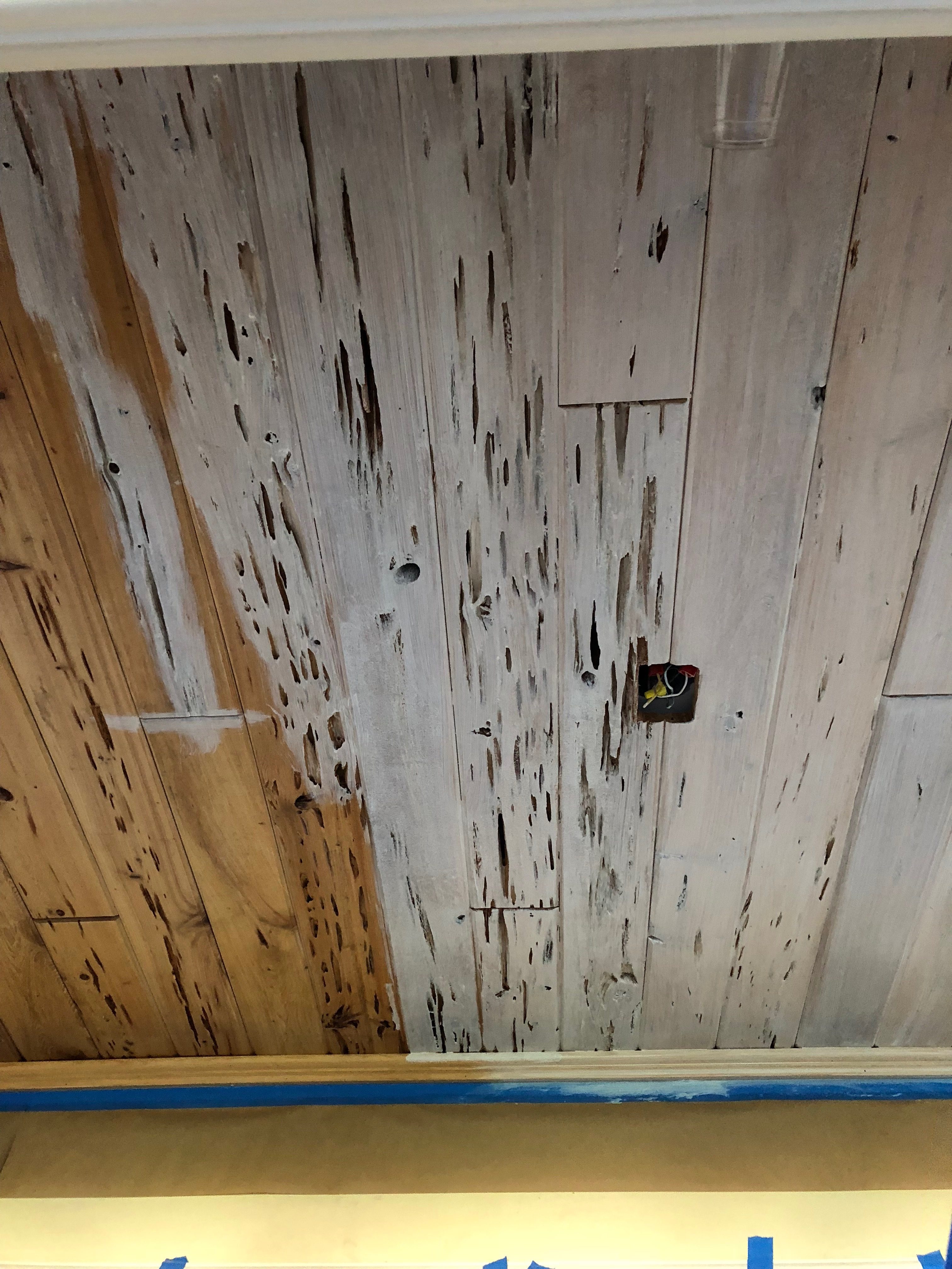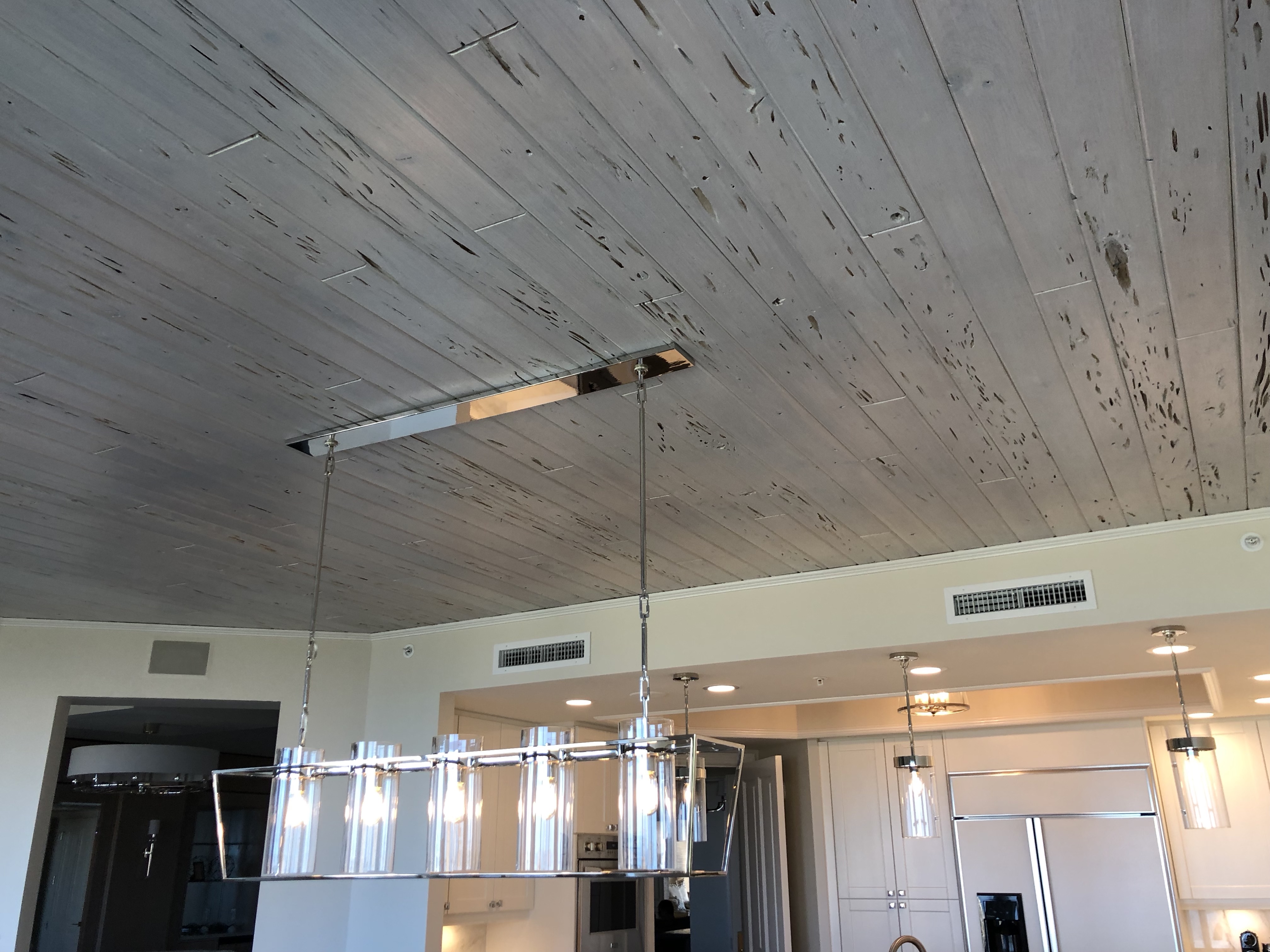 Luckily, my husband saw the potential of this ceiling.  It is made from an indigenous wood, and has knots and holes and imperfections.  We had the ceiling painted with a white-wash so you can still see the character of the wood.  I love it now!