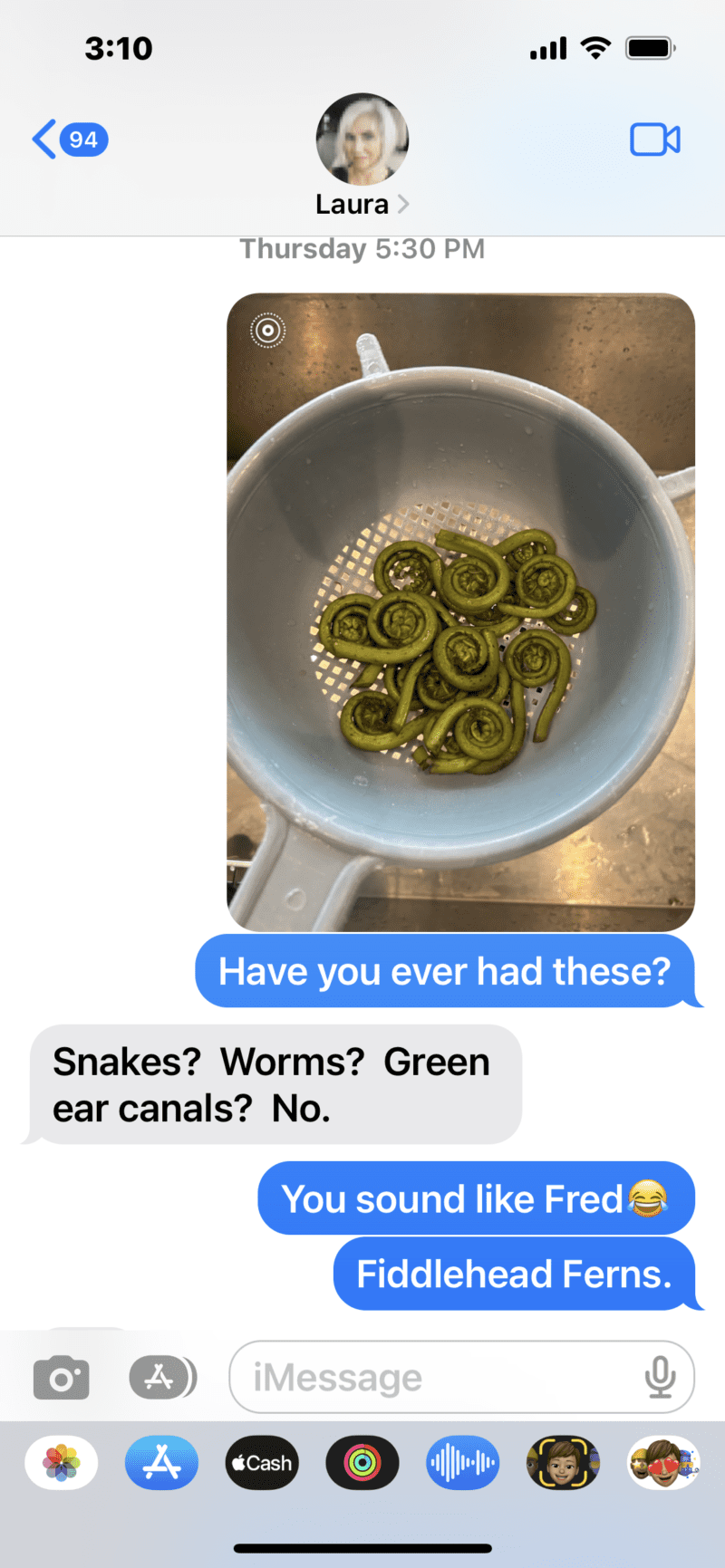 My husband wouldn’t eat them. He was too put off by the appearance. I thought they were tasty, but I’m not sure they would make my must-have over and over again list. When I sent a picture of my pre-cooked fiddleheads to Laura and asked her if she had seen them before and knew what they were, this was her response: