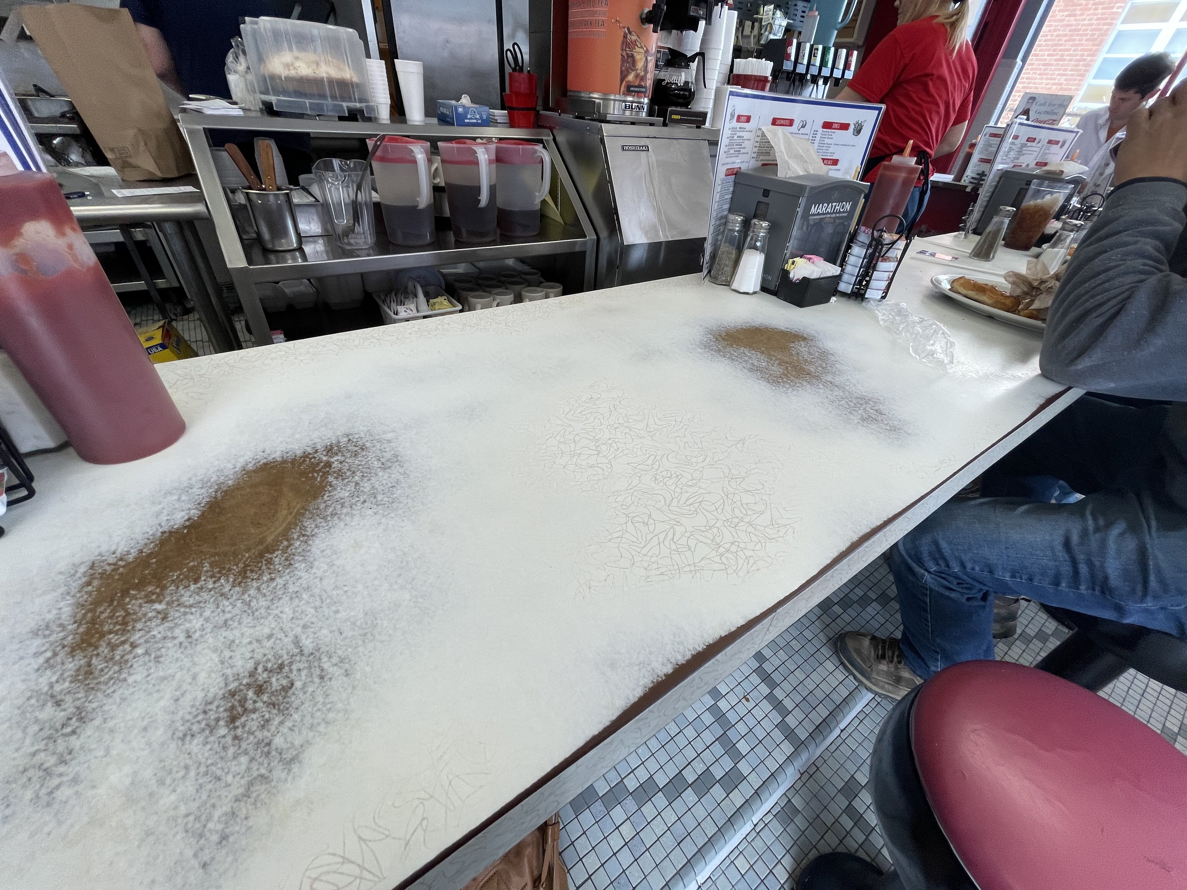 The countertop is the same linoleum since at least the 70s (probably earlier) with well-worn spots from plates sliding on and off.