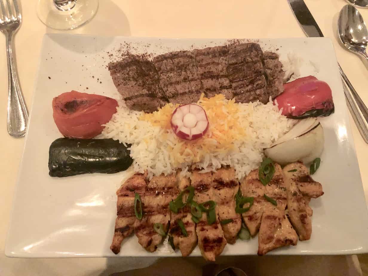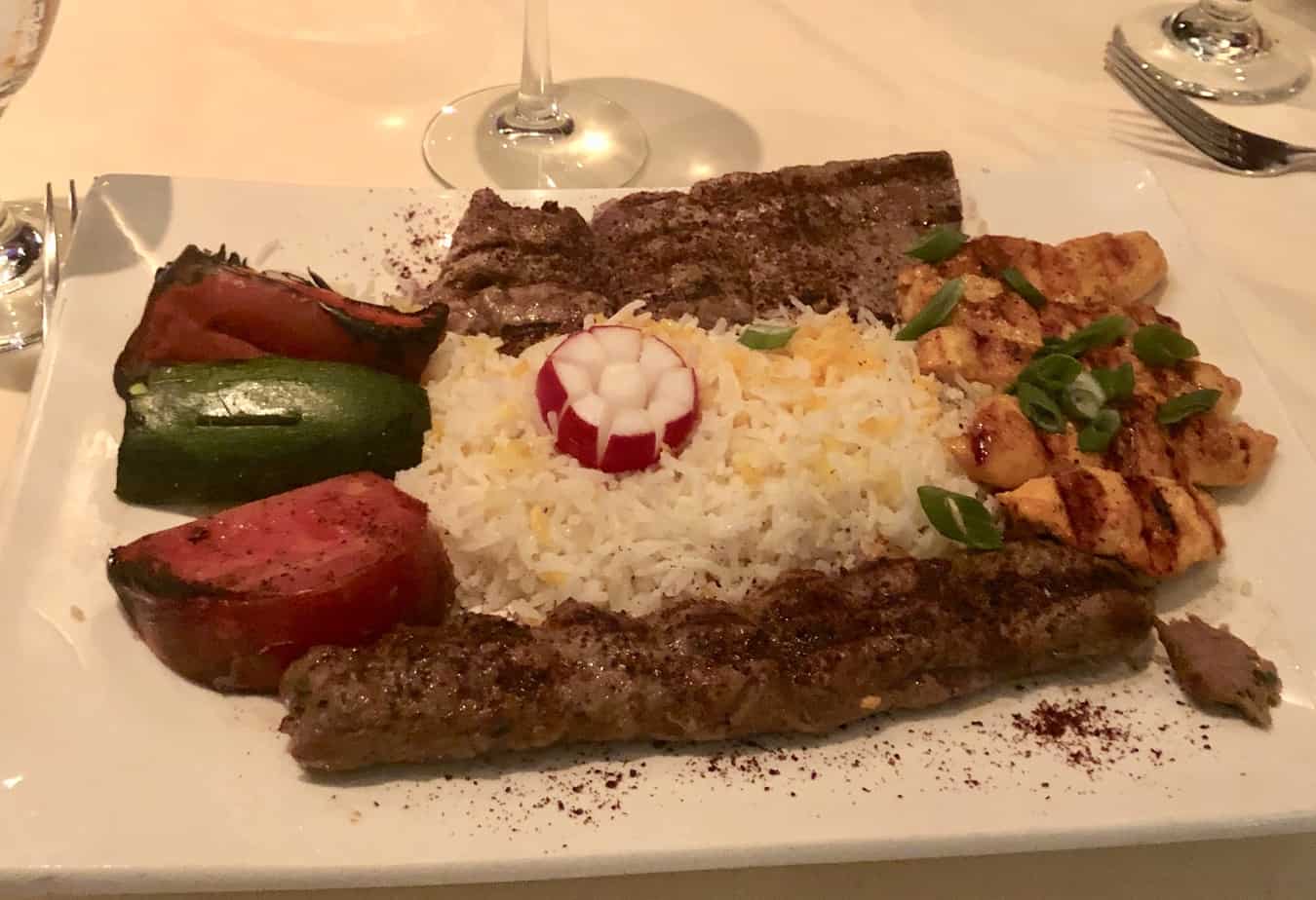 The mixed grill kabob (chicken, marinated beef tenderloin, lamb and a ground mix of beef and lamb skewers, with chargrilled vegetables was out of this world, and the night I ate it I swore I would have to order it every time I came.