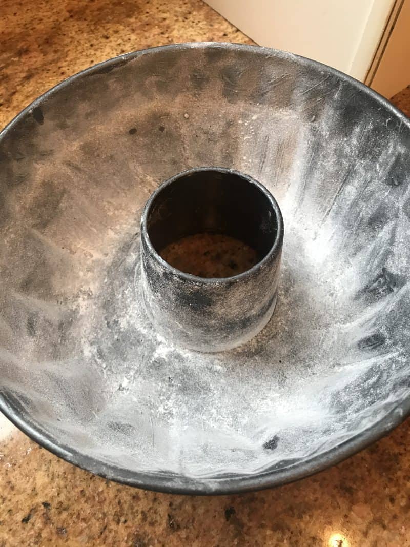 This may sound ridiculous, but my least favorite task related to baking is greasing and flouring the pan. It’s important to do a good job with it so your baked goods don’t stick when trying to remove them. You know you’ve been thorough when the flour covers every area of the pan.