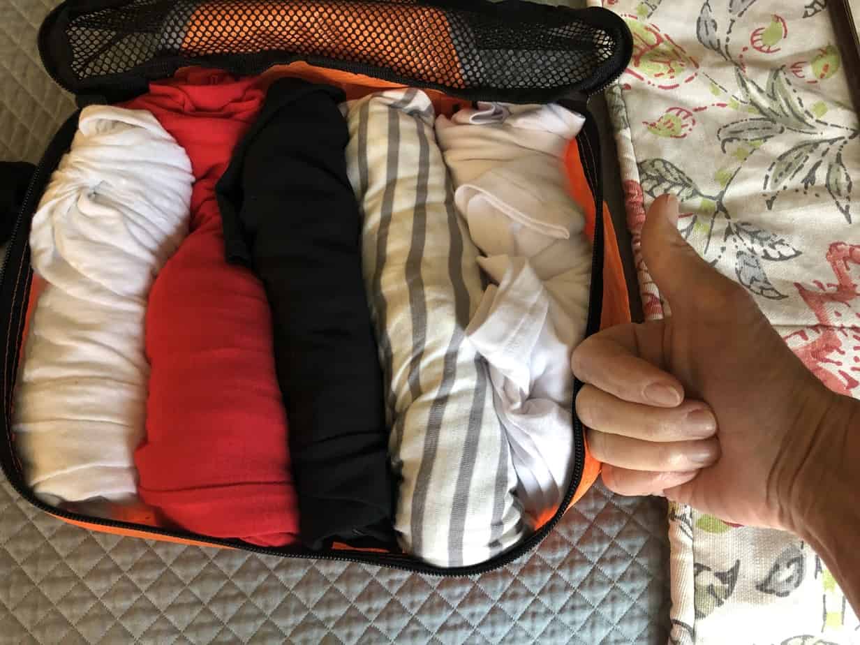 I was afraid that rolling my clothes would result in lots of wrinkles. Actually, the opposite is true; I was remarkably wrinkle-free. And when each item is rolled, it’s easier to see what’s what. Also, because of the cubes, I was able to get more into my suitcase, with room for souvenirs!