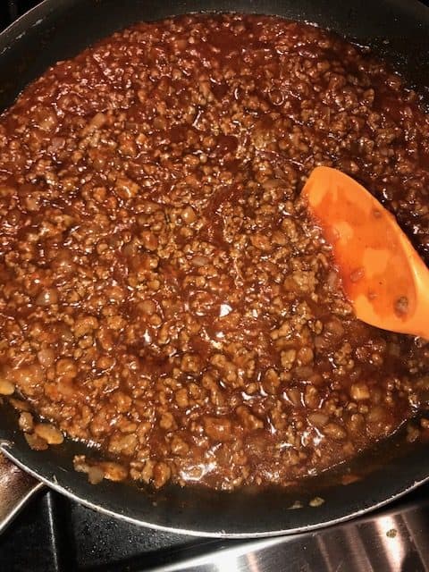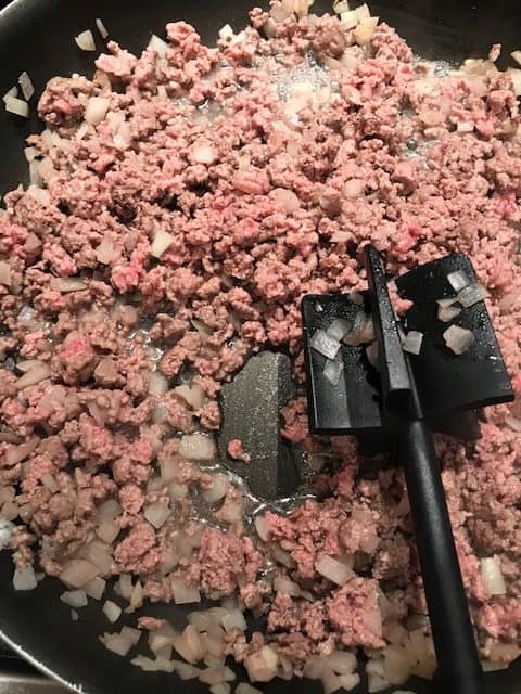 - Brown ground beef and onion in pan.