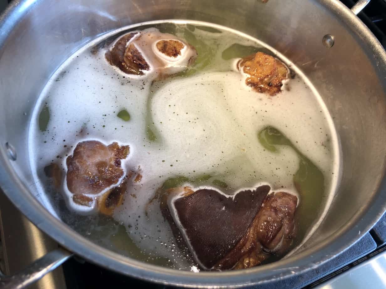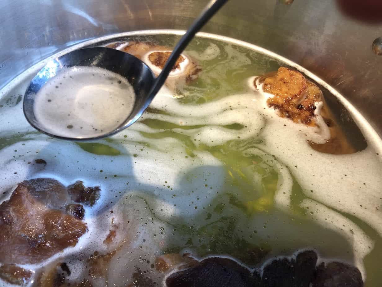 skimming white foam residue off split pea soup