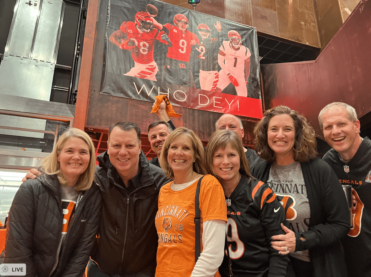 In Ohio we attend a terrific huge church (Crossroads), where you find your way into a “small group” for community, study, etc. Our small group currently includes six couples who have been together for over a decade. Here are four of the six couples at a crazy Super Bowl event at church: